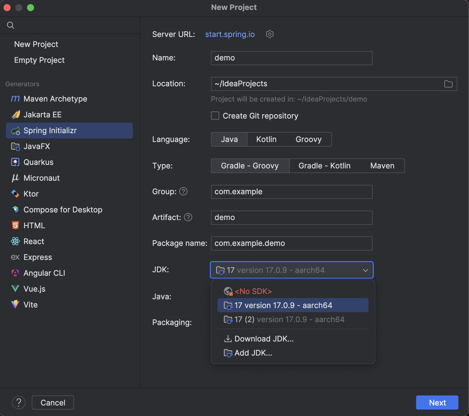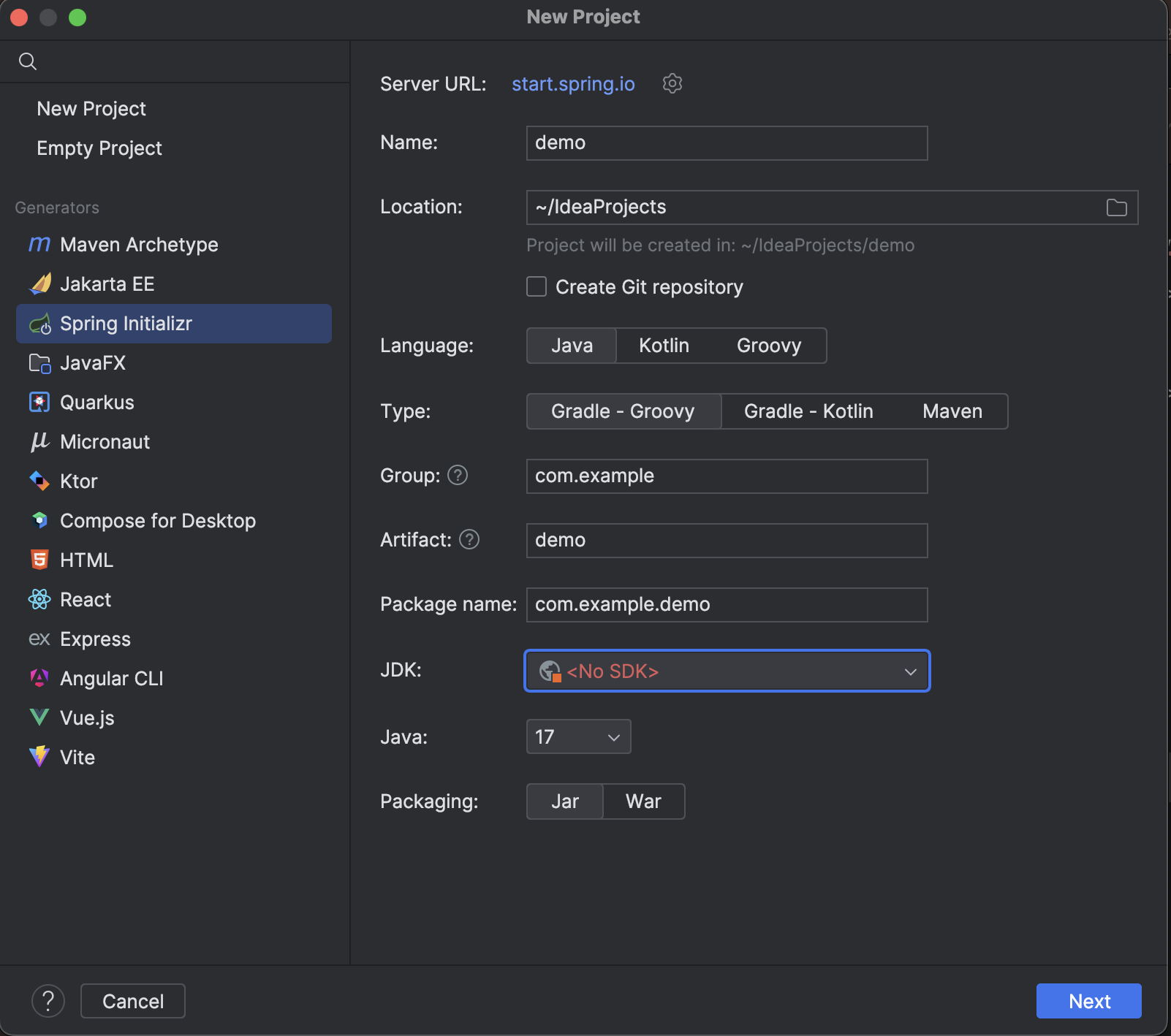 인텔리제이에서 스프링부트 플젝을 만드려는데 JDK가 없네요!