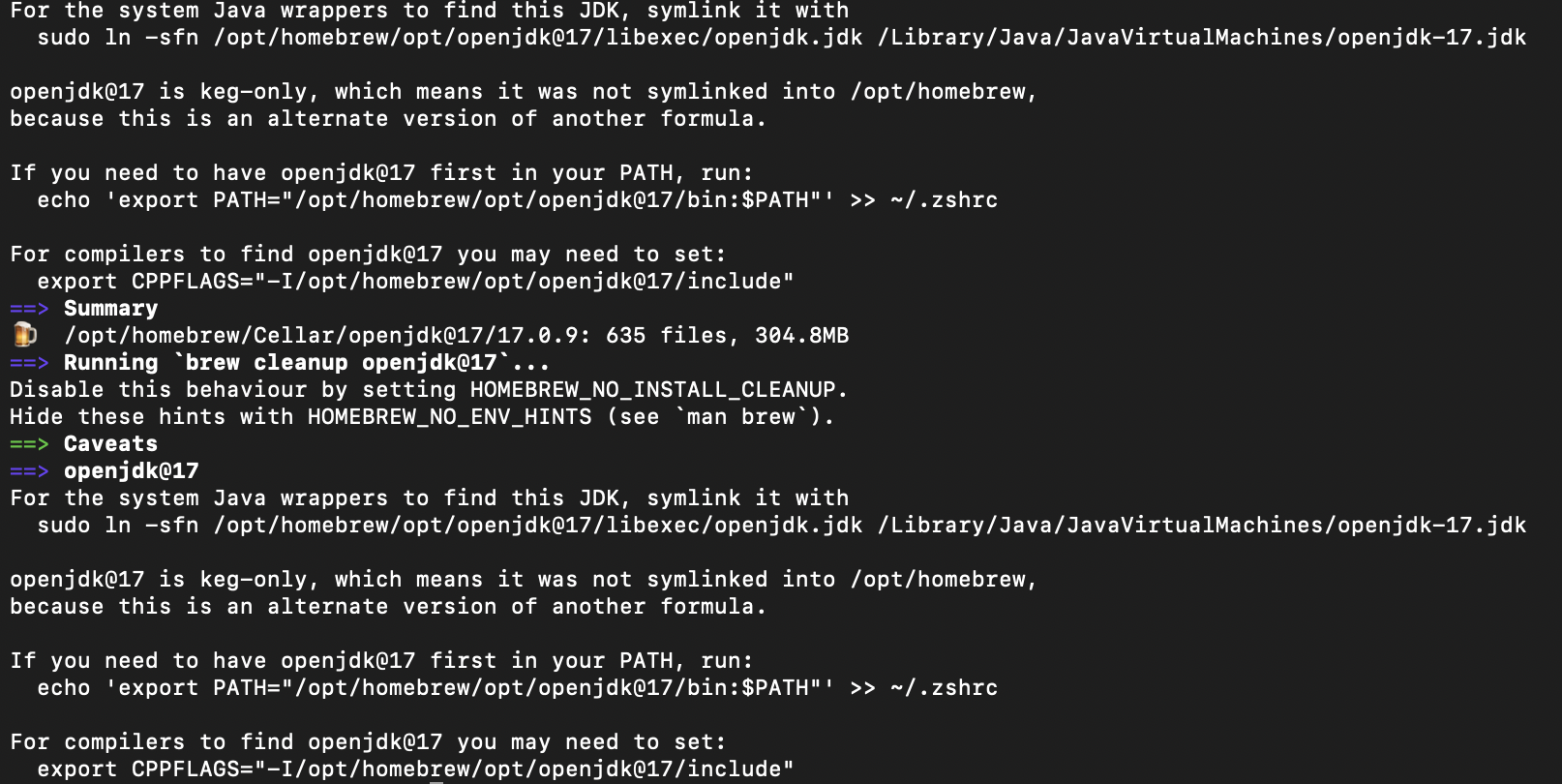 sudo ln -sfn /opt/homebrew/opt/openjdk@17/libexec/openjdk.jdk /Library/Java/JavaVirtualMachines/openjdk-17.jdk